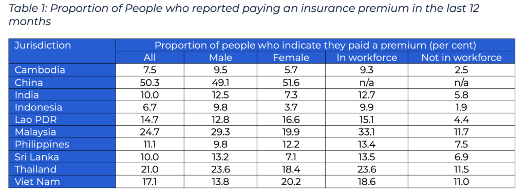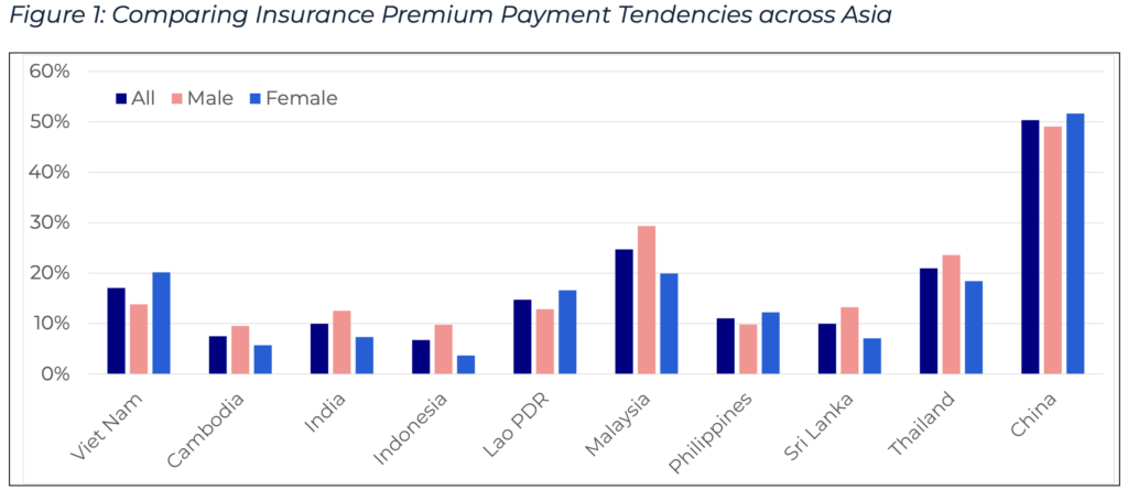 Men are more likely to report insurance premium payments in Cambodia, India, Indonesia, Malaysia, Sri Lanka and Thailand. In stark contrast, China, Lao PDR, the Philippines, and Viet Nam all report stronger premium payments from female respondents. Whilst there may be some explanation in the commonality of political systems between China, Lao and Viet Nam, this would make the Philippines an outlier compared to the other jurisdictions where male responses were higher.