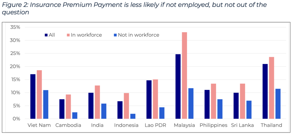 Being in the workforce is consistently an indicator that insurance is more available and utilised. All countries report higher insurance take-up among workers. However, there is considerable variation. In Malaysia, 1/3rd of employed people reported having insurance, whereas this was just under 10 per cent in Cambodia and Indonesia. For those who are not in the workforce, some are still insured, although at rates somewhere between 2 per cent and 12 per cent.