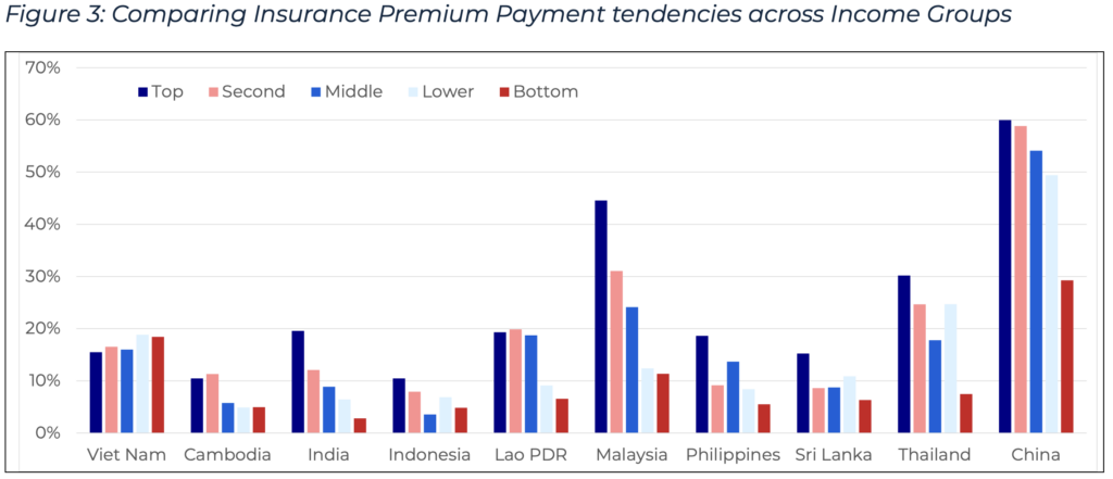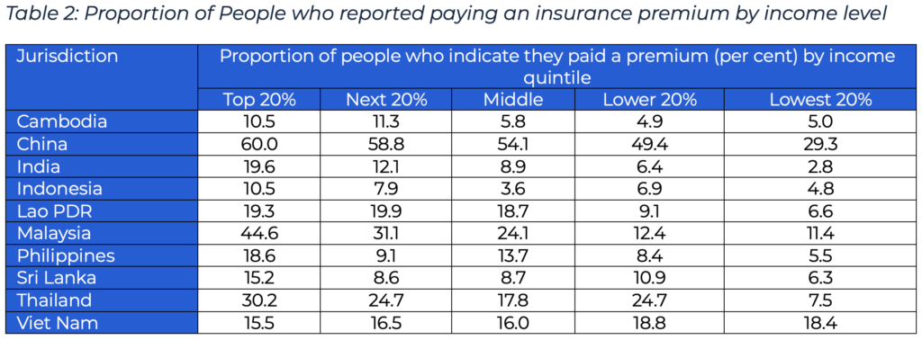 Rural communities often face significant challenges, and this is evident in Table 4 in Cambodia, China, India, Indonesia, and Malaysia. However, promisingly, rural communities have greater insurance utilisation in Laos, the Philippines, Sri Lanka, Thailand and Viet Nam.