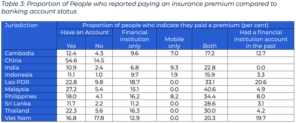Having a transaction account has been viewed as the entry point to financial inclusion. This has often been interpreted to mean that insurance must follow efforts to make banking services more inclusive. This is true across the region, with the notable exception of Viet Nam (see Table 3).