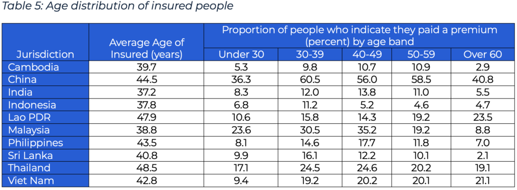 Information on the age profiles of insured people is valuable. The average age across countries varies, but it can be a feature of population age distributions. Within age groups, utilisation of insurance tends to be highest once people get to age 30 and, for older respondents, there is also a generally lower take-up (see Table 5). However, potential insurance solutions may vary considerably and contribute to the diverse results across countries. That said, this data point suggests that there is considerably deeper available data for insurance strategy and product development purposes in the data set, including by analysing age structure responses by sex or other characteristics.